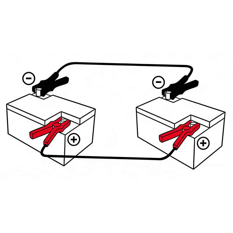 • சிவப்பு ஜம்பர் கிளாம்பின் ஒரு முனையை இணைக்கவும்நேர்மறை (+) முனையம்டிஸ்சார்ஜ் செய்யப்பட்ட பேட்டரியின்.