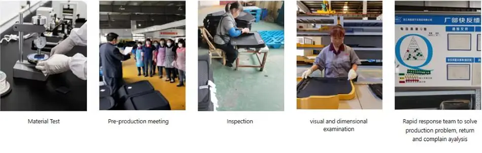 கார் மேட்களின் வடிவமைப்பு மற்றும் உற்பத்திக்கான ISO9001, தரக் கட்டுப்பாட்டுக்கு ISO/TSI16949, சுற்றுச்சூழல் மேலாண்மைக்கு ISO14001:2015, சமூகப் பொறுப்பிற்கான BSCI மற்றும் மூலப்பொருட்களுக்கான EU ரீச் தரநிலைகள் ஆகியவற்றுடன் நாங்கள் முழுமையாக இணங்குகிறோம். SGS,Intertek அல்லது வாடிக்கையாளர்களுக்குத் தேவைப்படும் வேறு ஏதேனும் மூன்றாம் தரப்பு இன்ஸ்பெக்டரால் செய்யப்படும் சோதனைகளில் எங்கள் தயாரிப்புகள் தேர்ச்சி பெறுவதை உறுதிசெய்ய சுய-சோதனைகளை மேற்கொள்ள எங்களிடம் உள்ளக சோதனை வசதிகள் உள்ளன.
