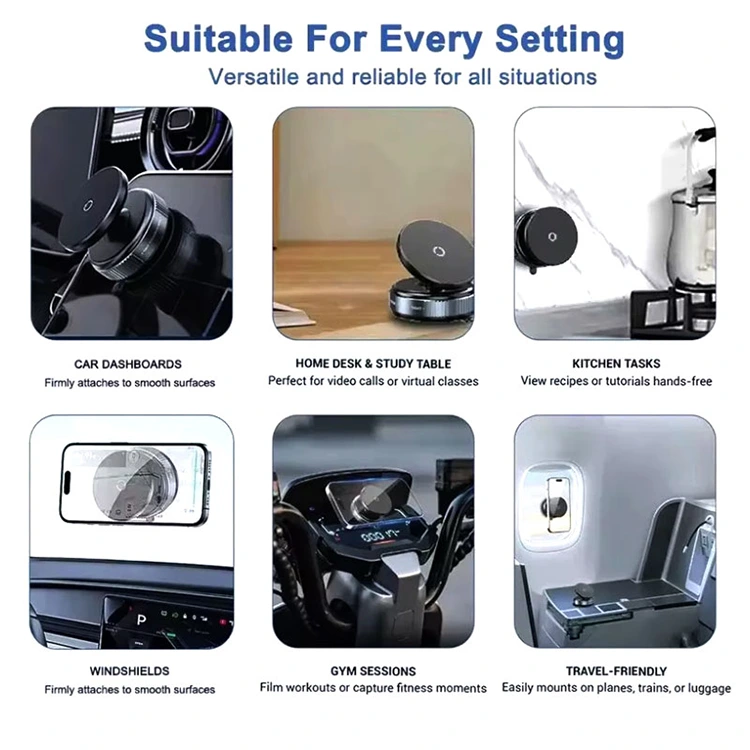 நெகிழ்வான பயன்பாடு: இந்த கார் ஃபோன் மவுண்ட் நிறுவ எளிதானது மற்றும் பாதுகாப்பானது. எந்தவொரு மென்மையான மேற்பரப்பிலும் உறுதியாகப் பூட்டுவதற்கு அடித்தளத்தை இடதுபுறமாகத் திருப்பவும். அதை அகற்ற அல்லது இடமாற்றம் செய்ய, தளத்தை வலதுபுறமாகத் திருப்பவும். 360° சுழலும் பந்து கூட்டு உங்கள் மொபைலை அதிகபட்ச வசதிக்காக எந்த கோணத்திலும் சரிசெய்ய உதவுகிறது.
