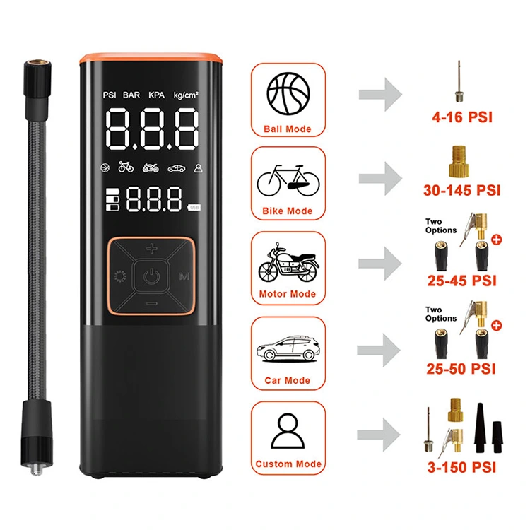அழுத்த அலகுகள்: PSI, KPA, BAR, KG/CM² மற்றும் நான்கு முன்னமைக்கப்பட்ட பணவீக்க முறைகள். உங்கள் வாகனத்திற்கு ஏற்ப நான்கு முன்னமைக்கப்பட்ட முறைகளின் அழுத்தத்தை அமைக்கலாம். இந்த காற்று பம்ப் இதற்கு ஏற்றது: