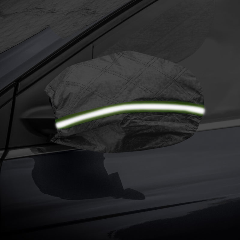 ஸ்னோப்ரூஃப் கார் கவர்க்கான பாதுகாப்பு அம்சங்கள்: கண்ணாடிப் பைகளில் பிரதிபலிப்பு கீற்றுகள் உள்ளன, அவை இருண்ட அல்லது பனி காலநிலையில் உங்கள் காரைப் பார்க்க எளிதாக்குகின்றன, வாகன நிறுத்துமிடங்களில் ஏற்படும் அபாயங்களைக் குறைக்கின்றன.